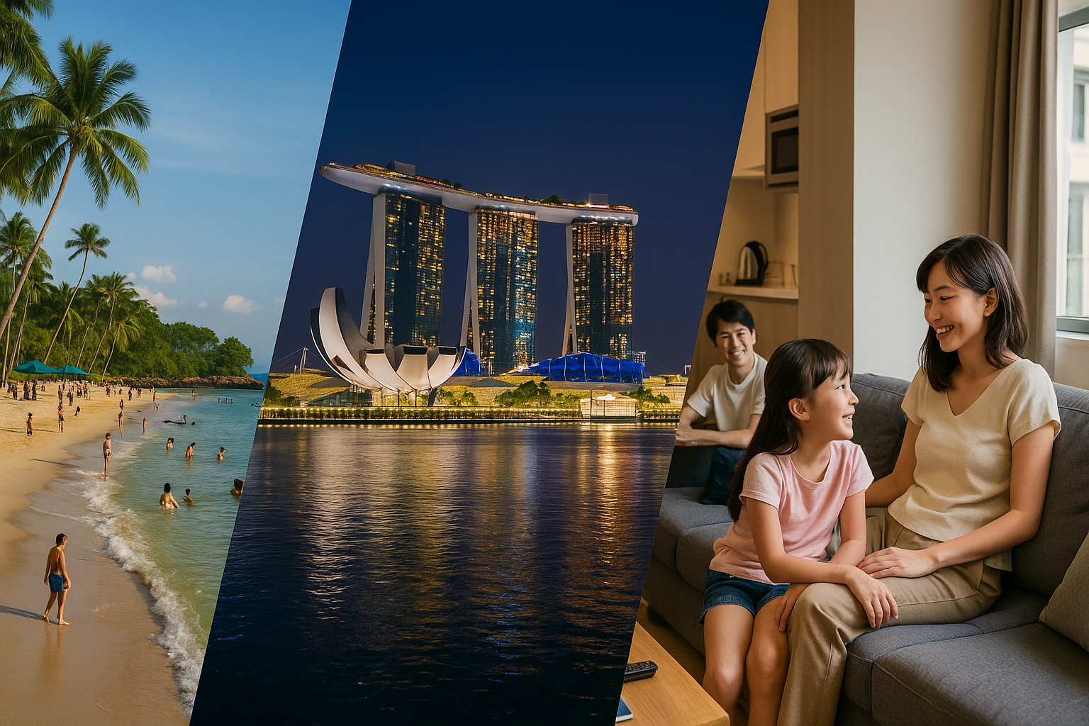 | キッチン、洗濯機、広いリビングスペース完備、コンドミニアムタイプ | サマセット リャンコート シンガポール: クラークキー近く、2ベッドルームは約80㎡~など広さが魅力、キッチン・洗濯乾燥機完備 フレイザー レジデンス オーチャード シンガポール: プール・ジム・キッズルームなども備わっていることが多い CapitaSpring Residences (2025年以降新施設予定): 1~3ベッドルーム、屋上ガーデン併設との情報も | 自炊や洗濯ができるので、離乳食期の赤ちゃん連れや長期滞在での荷物削減、食費節約に貢献。リビングが広く、家族みんなでくつろげる。 | 1泊あたりの単価は同等クラスのホテルより15~30%程度高めになることが多い。毎日のハウスキーピングがない場合も。 | 1週間以上の長期滞在、祖父母も一緒の3世代旅行、アレルギー対応食などで自炊が必要な家族、広い部屋でゆったり過ごしたい家族 |